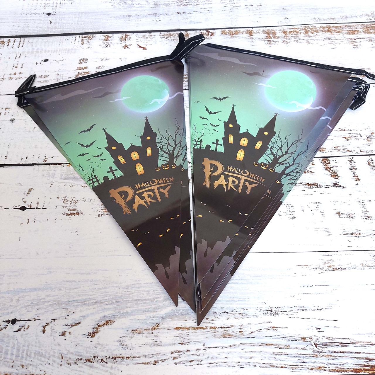 Гірлянда Хеллоуїн прапорці №26 - найпопулярніший і найпопулярніший декор на Хеллоуїн. Гірляндою можна прикрасити будь-яку частину інтер'єру, і скрізь вона виглядатиме гармонійно! Класна паперова гірлянда – склеювання на Halloween. Відмінно підійде для прикраси залів, пабів, ресторанів та нічних клубів на Хеллоуїн. Гірлянда з прапорців виготовляється методом цифрового друку. Яскравість фарб та якість друку чудово та незмінно з часом. Як кріплення використовується капроновий шнур. Така прикраса, напевно, запам'ятається Вашим гостям і додасть яскравих фарб у Ваш інтер'єр. Оптовий постачальник №1 в Україні товарів для свята Карнавал Приколів пропонує широкий асортимент декору для свят та вечірок.